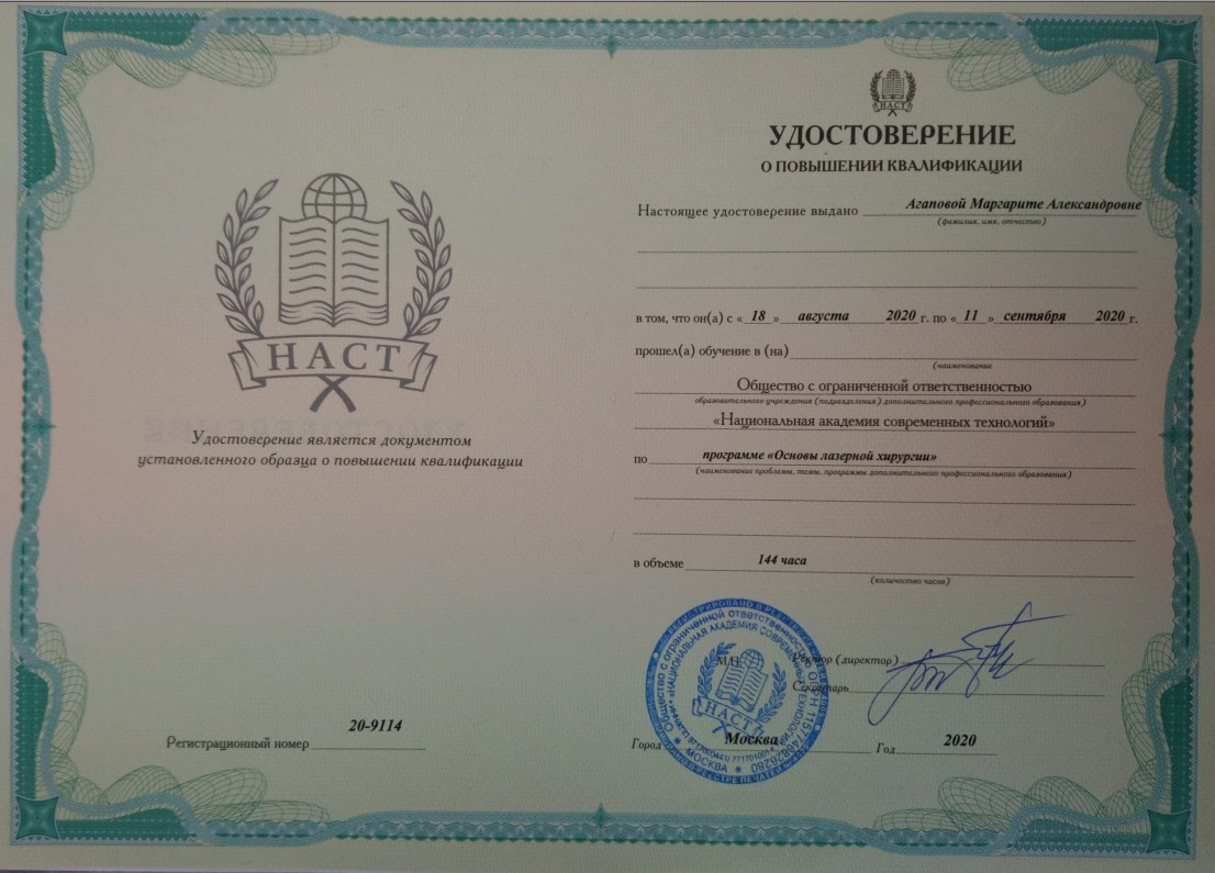 2017 г. – повышение квалификации по программе «Челюстно-лицевая хирургия» на базе ВГМА им. Н.Н. Бурденко