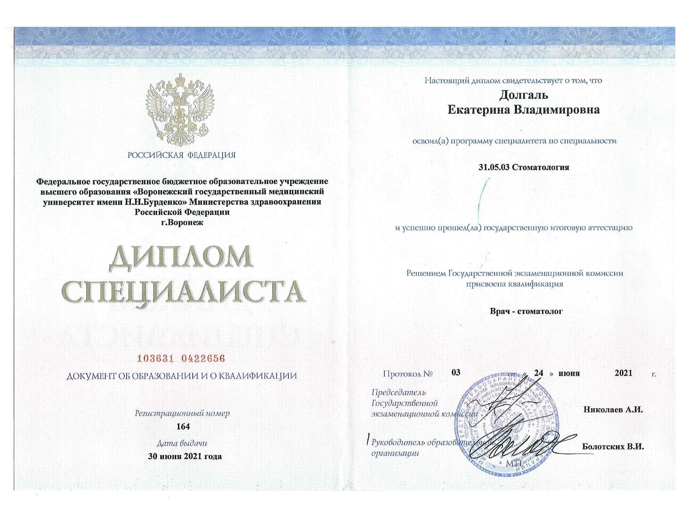 2021 г. Воронежская государственный медицинский университет им. Н.Н. Бурденко. Квалификация — Врач стоматолог