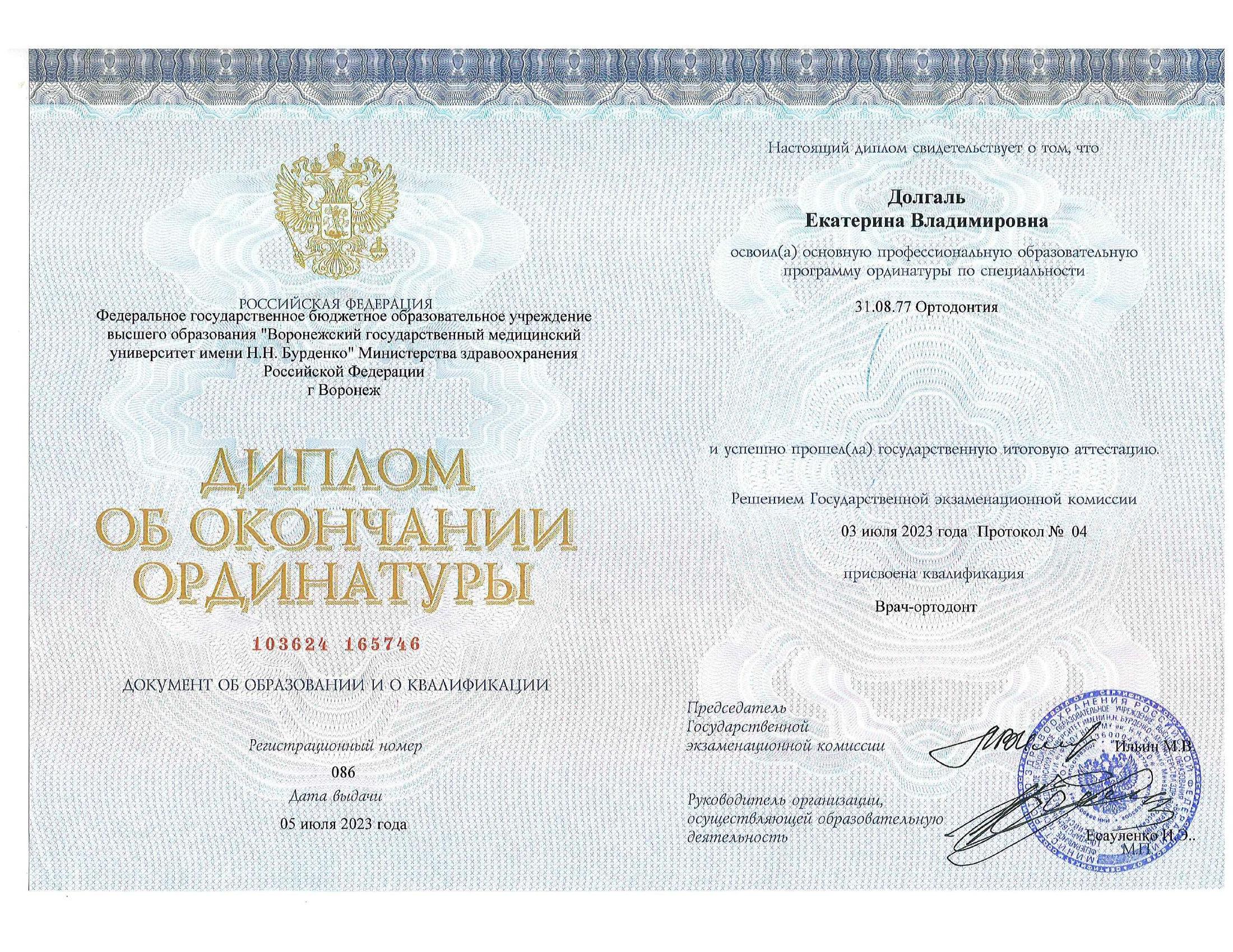 2023 г. Воронежская государственный медицинский университет им. Н.Н. Бурденко. Ординатура. Квалификация — Врач-ортодонт