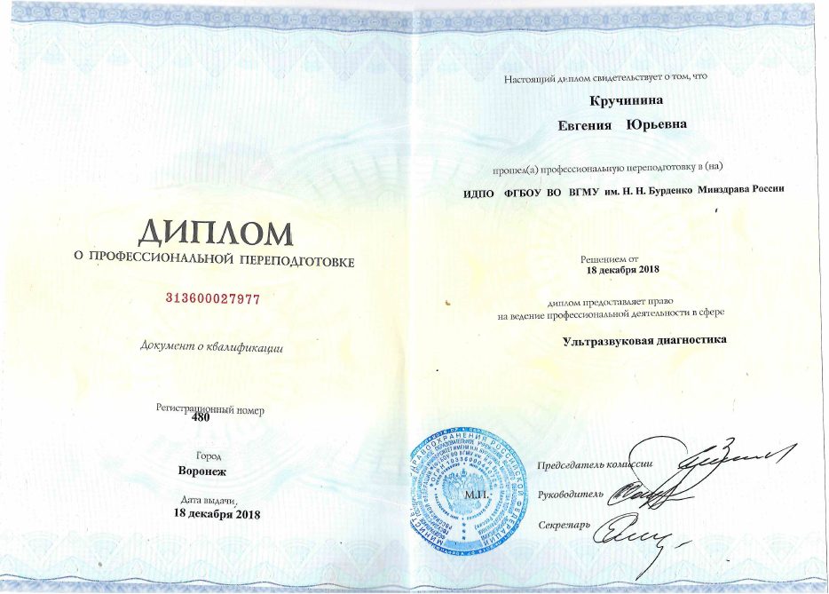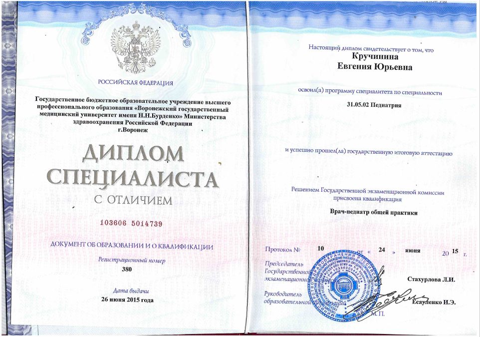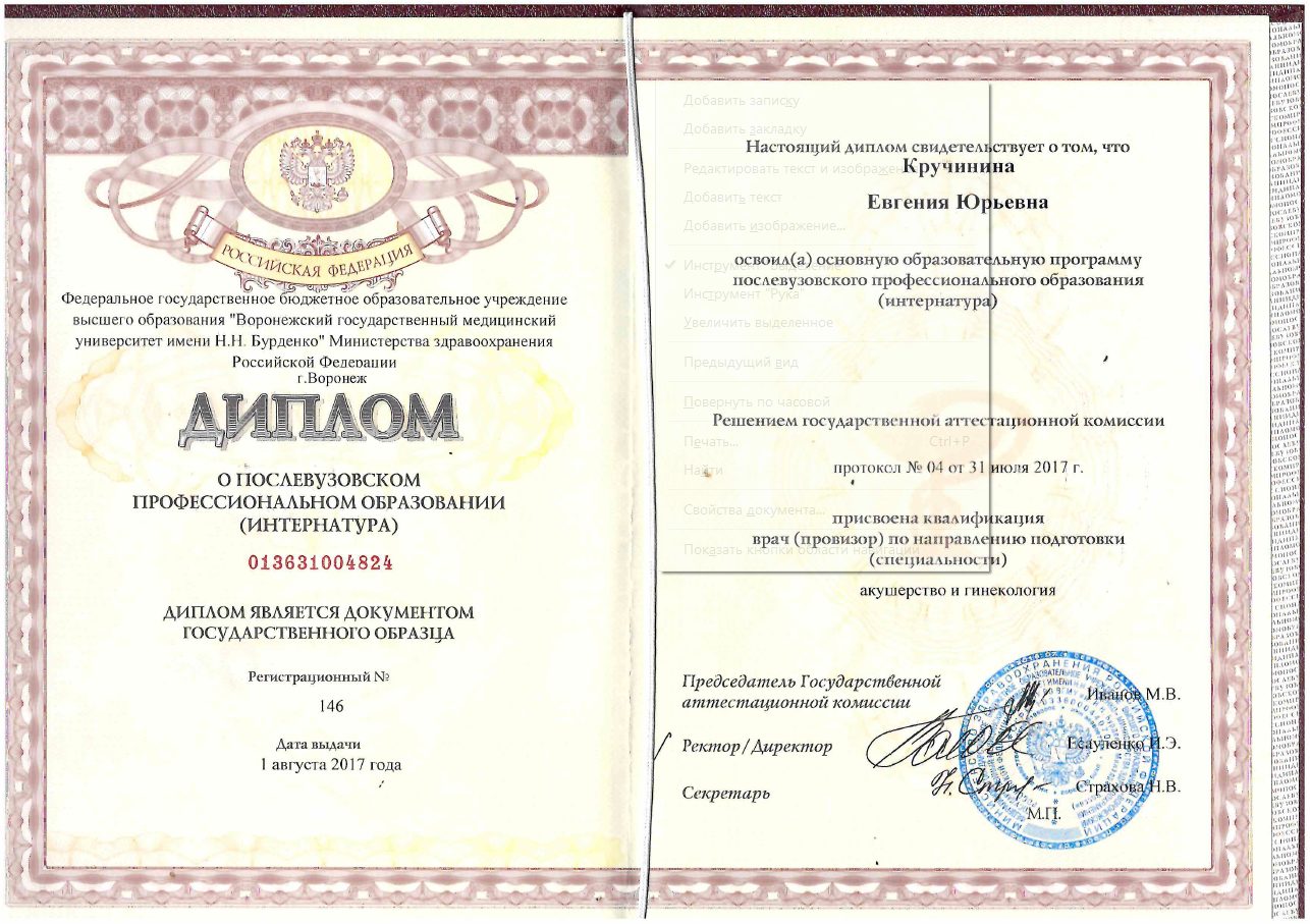 2015 — окончила ФГБО ВГМУ УВО, Воронежский государственный медицинский университет им Н.Н. Бурденко «Министерства здравоохранения Российской Федерации, по специальности акушерство и гинекология