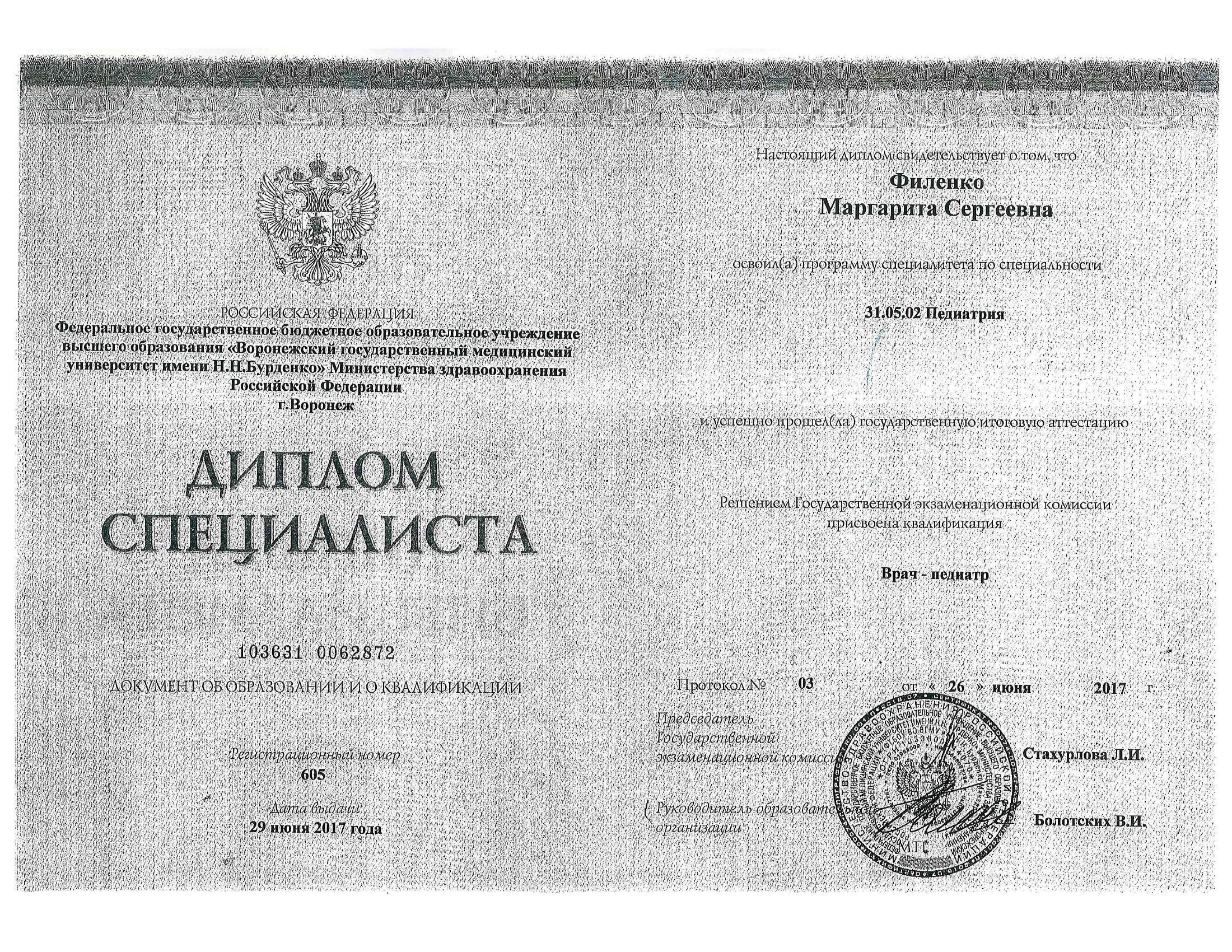2017 г. Воронежская государственный медицинский университет им. Н.Н. Бурденко. Квалификация — Врач педиатр