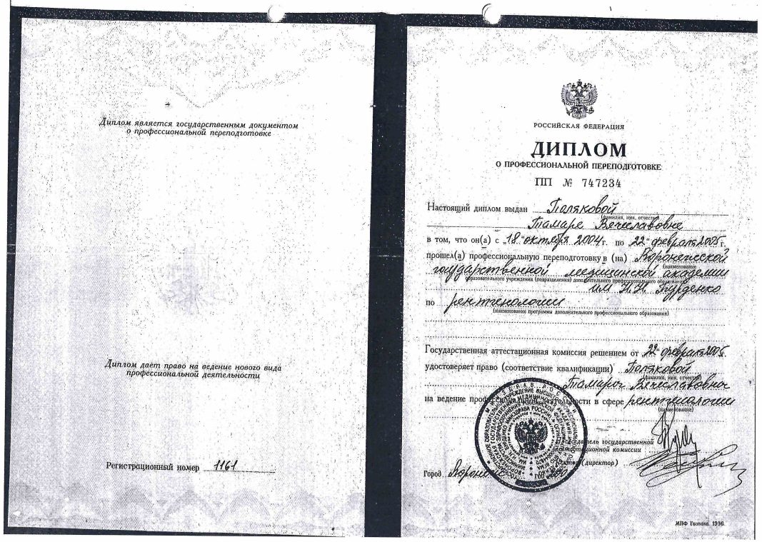2023 г. – АНО ДПО Новосибирская академия непрерывного образования работников здравоохранения. Специальность — Ультразвуковая диагностика