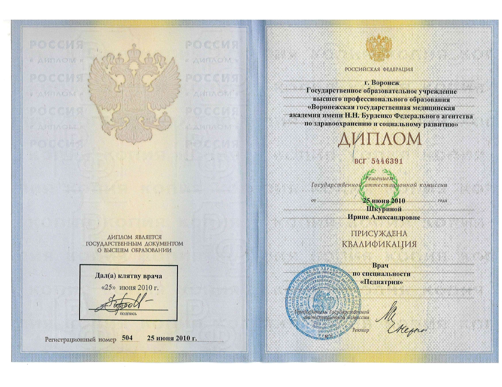 2010 г. Воронежская государственная медицинская академия им. Н.Н. Бурденко. Квалификация — Врач по специальности Педиатрия