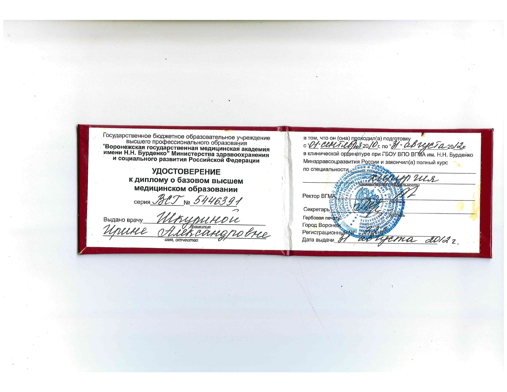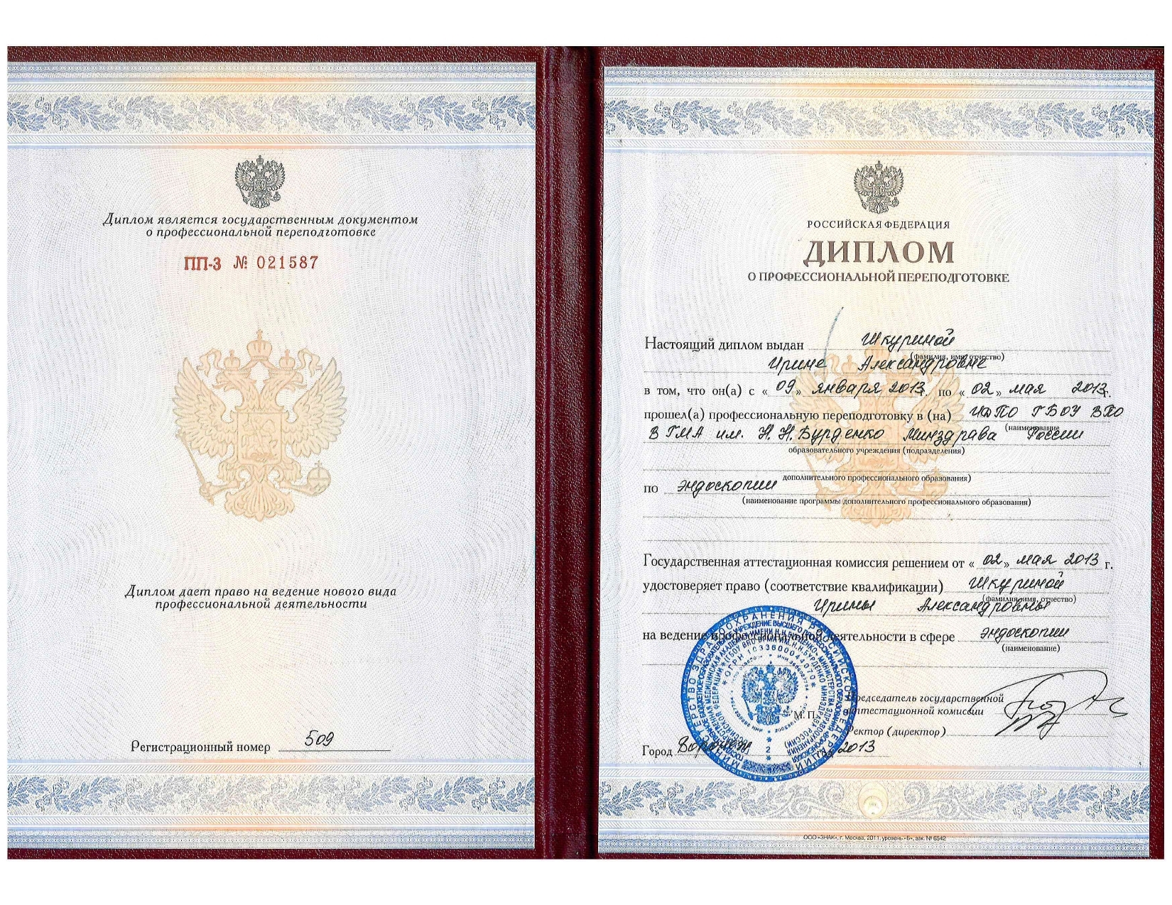2013 г. — Воронежская государственная медицинская академия им. Н.Н. Бурденко. Специальность — Эндоскопия