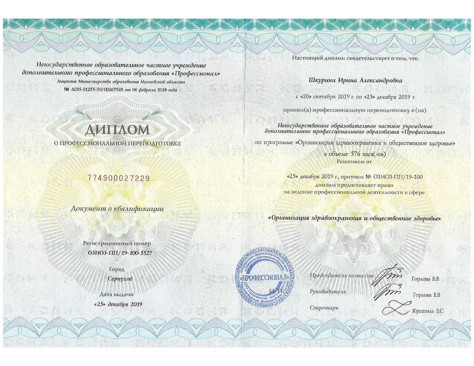 2019 г. — Негосударственное частное учреждение ДПО «Профессионал». Профпереподготовка по программе «Организация здравоохранения и общественное здоровье»