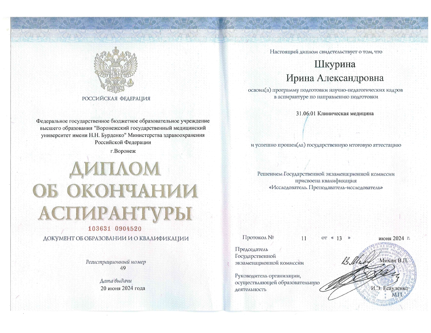 2024 г. — Воронежская государственная медицинская академия им. Н.Н. Бурденко. Аспирантура. Квалификация — Преподаватель-исследователь.