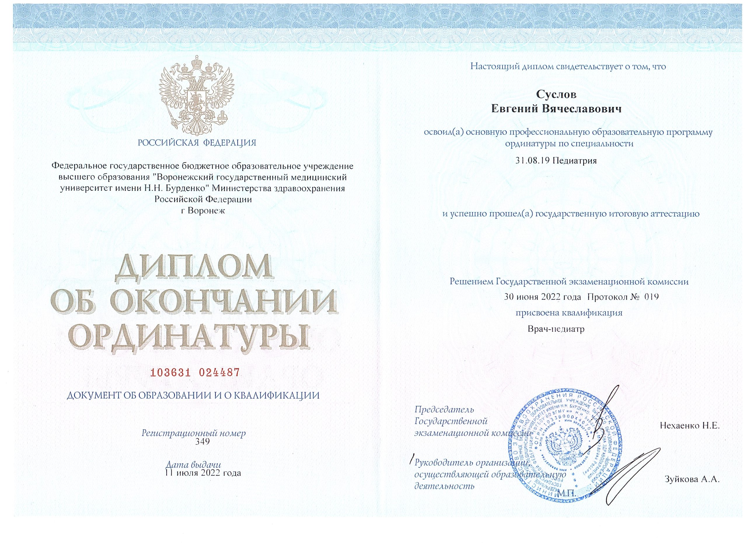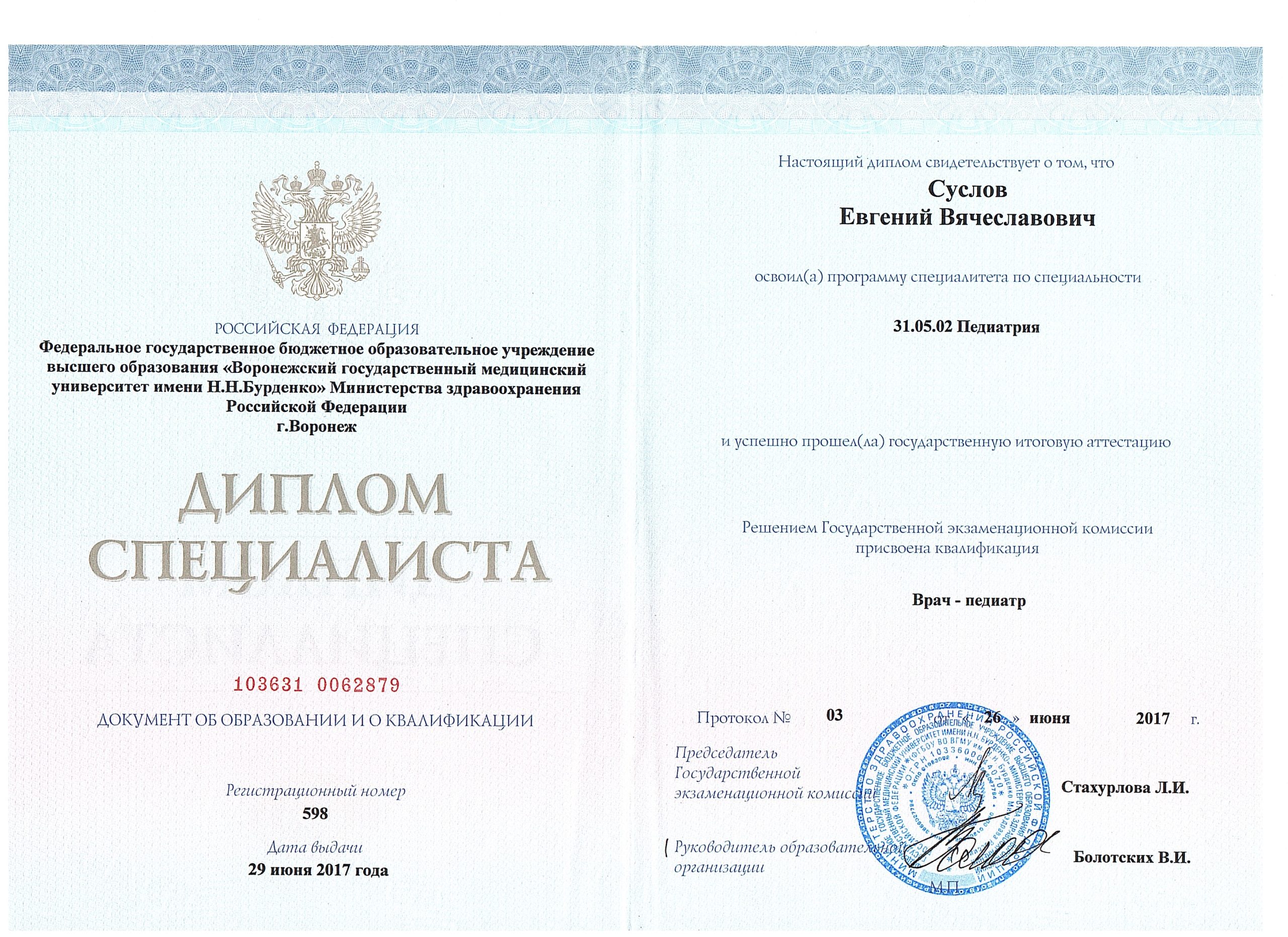 В 2017 г. окончил педиатрический факультет ВГМУ им Н.Н. Бурденко.
