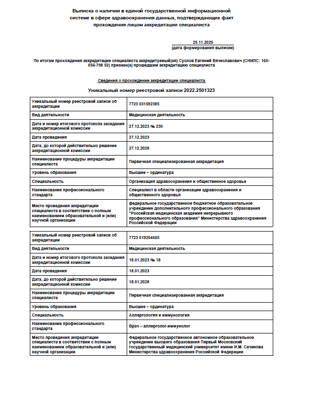 | Повторный прием педиатра, детского пульмонолога, аллерголога Суслова Е.В. | 3000 | 3000 |