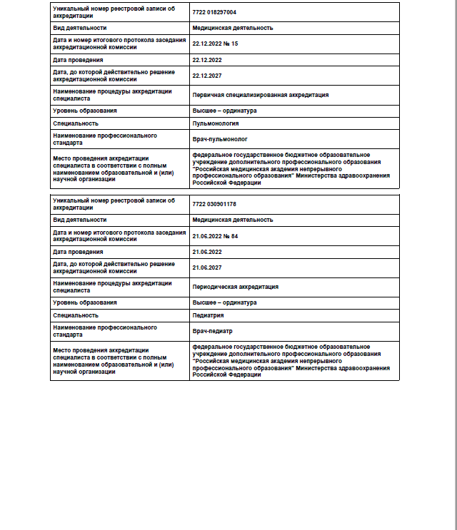 2019г. — повышение квалификации по программе “Актуальные вопросы детской пульмонологии”